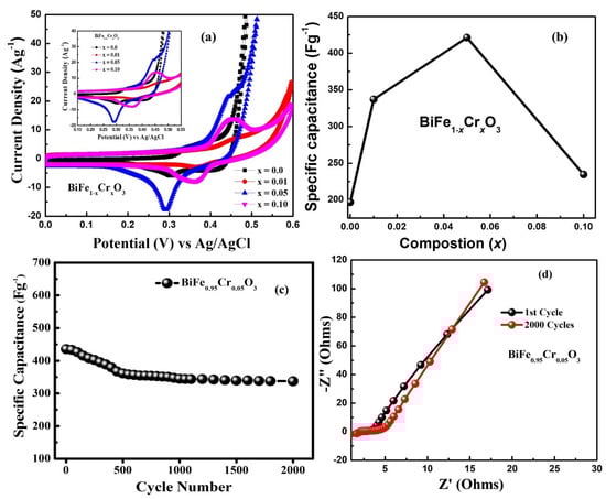 The electrochemical performances of BiFe1−xCrxO3 (0 ≤ x ≤ 10) electrodes were studied with the help of the cyclic voltammetry (CV). The CV curves of all the electrodes were recorded in a 2 M KOH aqueous solution with the three-electrode system in the range of 0.0 to 0.6 V at different potential scan rates of 10–100 mV s−1. Figure 10 a–d shows the CV curves, and Figure 10e–h shows the specific capacitances of BiFe1-xCrxO3 (0 ≤ x ≤ 10) electrodes. It can be clearly seen in Figure 10a–d that all the studied electrodes showed redox peaks in the CV curve due to the transitions among the different valance states. It was found that the current response of BiFe1−xCrxO3 (0 ≤ x ≤ 10) electrodes increases with an increase in scan rate. Moreover, the height of the peaks observed in the CV curve shifted towards higher potential with an increasing scan rate from 10 to 100 mV s−1. The specific capacitance (see Figure 10e–h) determined using the CV plot was observed to decrease with the increase in scan rate. Kotz et al. [] reported that this type of behavior results due to the presence of inner active sites, which prevent the redox transitions in the CV at higher scan rates []. It can be clearly seen in Figure 10e–h that the electrodes of all the compositions exhibited the maximum value of specific capacitance of 10 mV s−1. Figure 10a highlights the comparison of CV plots of all the compositions at the scan rate of 10 mV s−1. It is noteworthy to mention here that 5%-Cr-doped BiFeO3 (see Figure 11b) has the maximum area under the curve in the CV plot, which demonstrates the highest capacitive reaction compared to other Cr-doped BiFeO3-based electrodes. Figure 11b represents the comparison of the specific capacitance with different Cr doping levels for BiFeO3 measured at the scan rate of 10 mV s−1. The values of the specific capacitance calculated using the CV curve at the scan rate of 10 mV s−1 were 196.64, 337.0, 421.32 and 234.47 F g−1 for pure, 1%, 5% and 10%-Cr-doped BiFeO3, respectively. Moreover, we observed that with the increase in scan rate from 10 to 100 mV s−1, the specific capacitance decreased (see Figure 11b) from ~421 to ~200 F g−1, respectively. In the past, many groups have studied the electrochemical performances of BiFeO3-based electrodes. Lokhande et al. studied the electrochemical performances of BiFeO3 thin films, and they found a specific capacitance of 81.0 F g−1 []. Likewise, 72.0 F g−1 of specific capacitance has been reported for BiFeO3 nanoflakes by Jadhav et al. []. BiFeO3 nanorods have also shown a specific capacitance ~450 F g−1 [,]. Even Cu-doped BiFeO3 structures have also shown a specific capacitance of 568.13 F g−1, as reported by Khajonrit et al. []. Since the stability of the electrode is very important for technological applications, the cyclic performance of 5%-Cr-doped BiFeO3 was tested for 2000 cycles, as shown in Figure 11c. It was found that the capacity retention of 5%-Cr-doped BiFeO3 was ~78%, which represents notable cyclic stability. Kinetics and interfacial behaviors of the fabricated electrodes of 5%-Cr-doped BiFeO3 were measured using electrochemical impedance spectroscopy (EIS). Figure 11d shows EIS spectra of the electrode before and after the performance of 2000 cycles. In the EIS spectrum, the x-intercept of the curve in the high frequency region replicates the equivalent series resistance (ESR), which arises due to the resistance originating from numerous sources, including the internal resistance of electrode material, that of the electrolyte and the resistance at the interface []. Figure 11d shows the value of ESR of 1.23 Ω for the 5%-Cr-doped BiFeO3 electrode before the cycling test. After 2000 cycles, a slight increase in the ESR value of about 2.70 Ω was observed. Furthermore, no distinct semicircle was observed in EIS spectra, which implies that the 5%-Cr-doped BiFeO3 electrode exhibits excellent capacitive behavior [,].