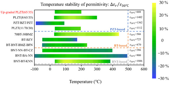 - Li, X.; Pu, Y.; Wang, Y.; Cui, Y.; Zhu, X.; Dong, Z. Temperature-stable dielectric properties from −45 °C to 250 °C in the system BaTiO3-(Bi0.5Na0.5)TiO3-Bi(Mg0.5Zr0.5)O3-Ba(Fe0.5Nb0.5)O3. Mater. Lett. 2017, 196, 153–156. [Google Scholar] [CrossRef]