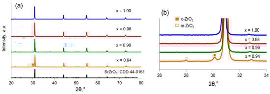 XRD patterns of the obtained SrxZr0.95Yb0.05O3-δ samples presented in Figure 1 were indexed on the basis of the SrZrO3 orthorhombic structure as confirmed by the corresponding ICDD file (44–0161). In the case of x ≥ 0.96, no traces of minor phases were observed. For x = 0.94, except for the peaks of the major orthorhombic phase, two minor reflexes at 28° and 30.1° were recorded as can be clearly seen in Figure 1b. These reflexes were ascribed to ZrO2 monoclinic structure and Yb-stabilized ZrO2 cubic structure. Based on the XRD data, it can be concluded that the Sr-deficient homogeneity boundary in SrxZr0.95Yb0.05O3-δ lays between x = 0.94 and x = 0.96; at the lower Sr contents, ZrO2-based minor phases arise.