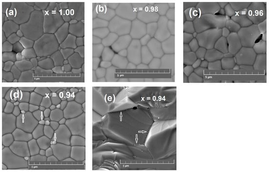 SEM images of SrxZr0.95Yb0.05O3-δ: the surface of (a) x = 1.00, (b) 0.98, (c) 0.96 and (d) 0.94 samples after polishing and thermal etching, (e) fracture of the x = 0.94 sample. The impurity phase grains are marked with arrows.
