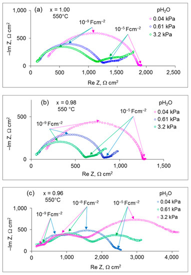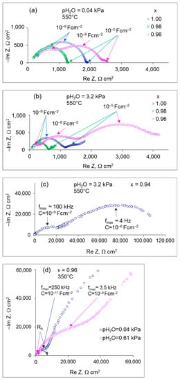 To demonstrate the effect of humidity on the conducting properties of the x = 0.96–1.00 samples, the Nyquist plots of the samples measured at different pH2O values are depicted in Figure 4. With increasing pH2O, both the bulk and grain boundary responses of the samples with x = 0.96–1.00 shrink, which can be explained by the growing proton conduction; while the interfacial response with the characteristic capacitance of ~10−5 F cm−2 significantly increases. Besides, a lower-frequency tail emerges in the spectra, which can be caused by slow gas diffusion through the porous electrodes.