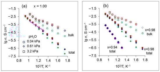 At low temperatures, Reaction (2) proceeds to the right to produce the protonic defects in the oxides. According to the law of mass action, the concentration of the bulk protonic defects increases proportionally to pH2O1/2. As temperature increases, the dehydration process progresses, with release of the proton defects from the oxide. So, in the low temperature range (below 600 °C), the bulk conductivity of the samples with x = 0.96–1.00 is mainly protonic, while at higher temperatures the contribution of protons in the charge transfer process decreases. Change of the dominant charge carriers causes the change of the bulk conductivity slope observed in the Arrhenius plots at ~600 °C (see Figure 5).