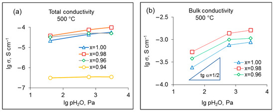 Figure 6 shows the total and bulk conductivities of SrxZr0.95Yb0.05O3-δ samples as functions of pH2O at 500 °C in a logarithmic scale. The conductivity of the x = 0.96–1.00 samples increases with increasing pH2O, which indicates the participation of protons in the process of charge transport. As can be seen in Figure 6b, at low humidity values, the slope of the bulk conductivity is close to ½, being in agreement with Reaction (2); as the humidity increases, the slope decreases, which can be caused by saturation of the oxides with H2O.