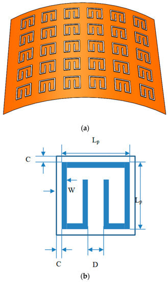 The flexible metamaterial film with array of silver split-ring resonators is shown in Figure 1a. The silver rectangle-shaped patterns are printed on one surface of the PI layer. The thickness of the PI film is 125 m, and the thickness of the silver patterns 17 μm. Figure 1b illustrates a unit cell and the notations of its dimensions. The array is arranged with a spacing of 2C between two patterns and the size of each pattern is Lp × Lp. The thickness of the wire is W and the split gap D. The geometric parameters (Lp, C, D and W) of the structure are adjusted in a numerical parametric study to achieve higher absorptivity.