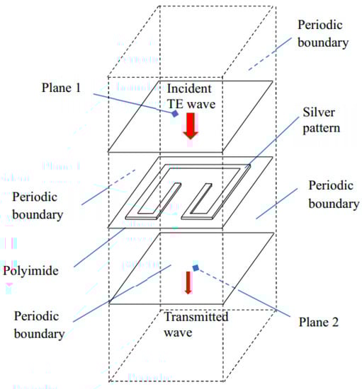 Figure 2 shows the physical model and the boundary conditions. To simplify the model, the solution domain includes only a unit cell of metamaterials and the upper and lower air spaces. As plotted in in Figure 2, Plane 1 is set to be the top incident surface where an incoming 1-W TE wave is emitted toward the cell. Plane 2 is located beneath the unit cell which receives the transmitted electromagnetic energy.