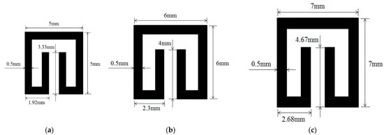 Dimensions of three tested split-ring resonators. (a) SRR1, (b) SRR2, (c) SRR3.