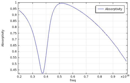 Figure 4 shows the dependence of absorptivity on the frequency of the EM wave for case SRR2. In the present study, Equation (8) is used to calculate the absorptivity of the metamaterial structure. It is found that for this case the maximum absorptivity reaches 0.99 at around 5.3 GHz and minimum absorptivity 0.43 at 3.7 GHz. Apparently, for SRR2, the operation frequency ought to be 5.3 GHz. Furthermore, similar analysis depicts that the operation frequencies for SRR1 and SRR2 are 6.5 GHz and 4.3 GHz, respectively.