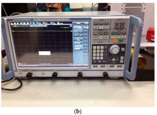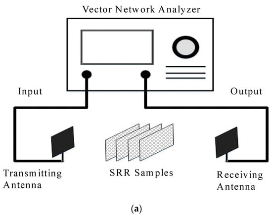 Schematic of the experimental system is illustrated in Figure 7a and the photograph of the vector network analysis is given in Figure 7b. The vector network analyzer, Rohde & Schwarz ZNB8 VNA, which produces microwave in the frequency range of 2~8.5 GHz is adopted to measure the network scattering parameters (S-parameters). The equipment enables the RF transmission between the transmitting and the receiving antennas. The SRR specimens are placed in between the two antennas. Note that getting the calibration plane dialed in correctly is the most crucial step in matching the network design. A poor calibration can result in significantly different results. The characteristics of the three fabricated SRRs are then measured and dependence of operation frequency with higher absorptivity on the dimensions of the split-ring resonators is investigated. Due to the limitation of the experimental system, the experimental chamber is not isolated perfectly and hence, over the air (OTA) testing is conducted to find the operation frequency with maximum absorptivity.