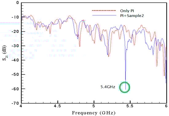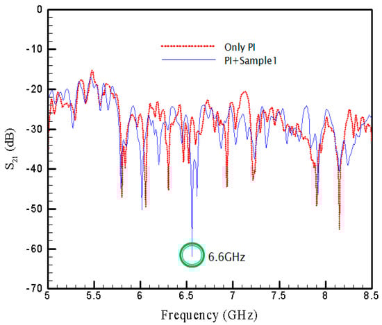 Figure 8 shows the experimental results of S21 versus frequency for the case SRR1, whose size is 5 mm, under the inevitable indoor noise. Nonetheless, in this figure the transmission coefficient for the PI film without the pattern array is also provided for reference. In comparison between the two curves with and without the printed patterns, one can find a significant drop for the curve with SRR1 at 6.6 GHz. As the value of S21 at this frequency is introduced into Equations (8) and (10), one can obtained the maximum absorptivity of 97.45%.