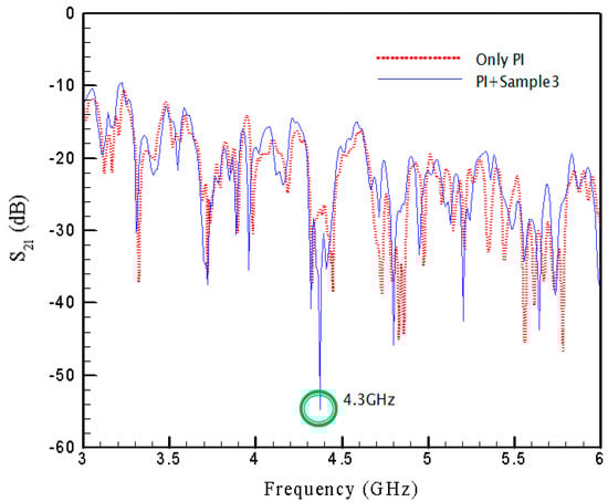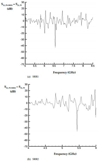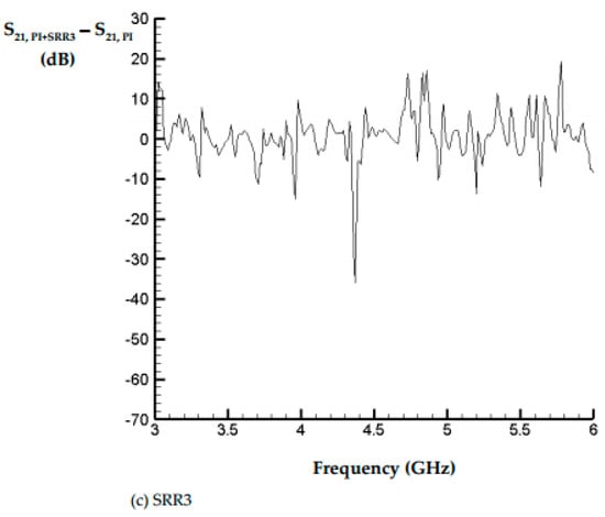 In Figure 8, Figure 9 and Figure 10, the spectrums corresponding to the pure PI film without SRRs are also provided using the red-dot curves in respective figures to show the influences of the existence of SRRs. One thus can see clearly the contribution from the SRR structure itself. The separate plots may be helpful for the difference between the PI film with and without SRRs. Therefore, In Figure 11, three plots, Figure 11a–c, are provided to display the difference for cases with SRR1, SRR2 and SRR3, respectively.