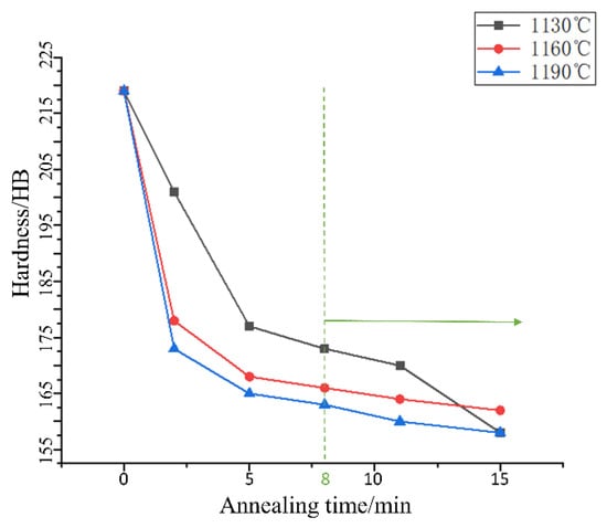 To speed up the test process, shorten the test period, obtain the gear failure data, and observe the obvious tooth-surface-wear effect, the gear sample being tested was thinned using the wire electrical discharge machining (WEDM) method, and the treated tooth width was set to 1/3 of the width of a standard gear tooth. The annealing process was used to reduce the tooth surface hardness of the helical gear. Figure 1 shows the effect of different temperatures on the hardness of 45# steel under the migration of annealing time [19]. The hardness significantly decreases after only 2 min of heat preservation; with the prolongation of the heat preservation time, the hardness continues to decrease, but the change range is small. According to Figure 1, the ideal softening effect is obtained when the heat preservation time is more than 8 min.