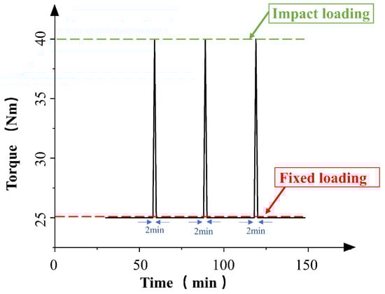 Figure 6a is the vibration signal diagram at the initial stage of wear, at a constant load of 25 Nm. At this time, the gear is in the running-in period, and the load is small. The vibration change mainly comes from the influence of the addition of hard particles. Figure 6b shows the vibration signal diagram under impact loading at the initial stage of wear. It is seen that, compared with Figure 6a, a peak value of 3.276 appears under impact loading, indicating that impact loading has a greater impact on the gear vibration amplitude.