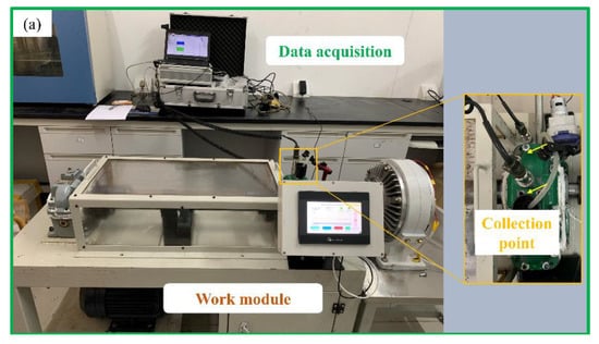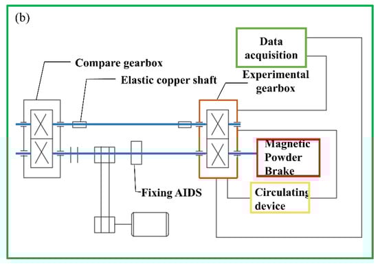Due to the excellent characteristics of the gearbox, an integrated gear test bench for data acquisition, used for impact load loading, was built. The test bench was divided into a data acquisition module and a working module (Figure 3a). The working module was mainly composed of a driving motor, a test gearbox, a secondary gearbox, an elastic shaft, and a magnetic powder brake. The output torque of the magnetic powder brake was controlled by adjusting the current size of the controller.