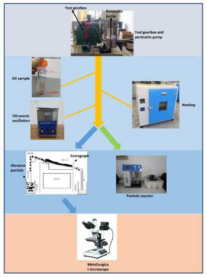 Gearbox oil contains a lot of gear wear information, and it is an important research tool in oil analysis, in order to extract the appearance characteristics, quantitative relationship, and chemical properties of the lubricating oil of abrasive particles [20]. In the test, 20 mL of oil samples were taken from the test gearbox every 60 min. For the obtained oil sample, 5 mL was taken to prepare the spectrum, and the remaining 15 mL was detected by the YJS-170 particle counter, in order to determine the size and quantity of the abrasive particles in the oil. The experiment used a peristaltic pump to ensure the uniformity of abrasive particles in the test gearbox (Figure 4). The prepared ferrograms were observed by a metallographic microscope, to determine the shape of abrasive grains in different wear periods. All instrument specifications and manufacturers in Figure 4 are shown in Table 2.