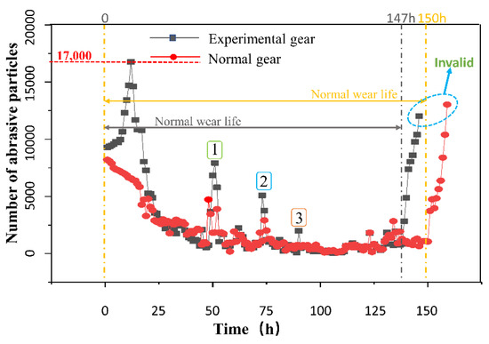 It can be seen from the figure that the abrasive particle concentration soars to 17,000 particles/mL within 0–20 h in the group of experiments with hard particles at the early stage of wear, due to the influence of hard particles, and then decreases rapidly and remains at 2000 particles/mL for a long time. At this time, it enters the stable wear period. In the experimental group, the abrasive particle concentration rises rapidly to 12,500 particles/mL after 130 h, and then the gear teeth break and fail.