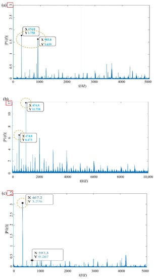 The frequency spectrum of the vibration signal carries a large amount of gear fault information, which determines whether the gear is abnormally worn [24,25,26]. The experimental speed of the pinion in the wear test in this paper is 1200 r/min. Under this condition, the power frequency f1 of the motor and driving wheel is calculated as 20 Hz, the power frequency f2 of the large gear is 5.122 Hz, and the meshing frequency Fz is 420 Hz. Using squared envelope spectrum analysis, noise reduction is performed through the periodic change of vibration signal energy with time. By constructing analytical signals, the squared envelope spectrum is Fourier-transformed, to extract fault features (Figure 6).