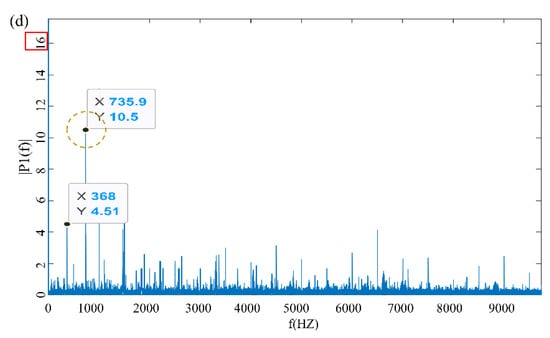Figure 6c,d are the vibration signal diagram under 25 N m dead load in the later stage of wear and the vibration signal diagram under impact load after gear failure, respectively. The obvious fault signal is seen in the figure, which is due to the abnormal vibration caused by the broken gear and the severe wear of the tooth surface; the fault signal amplitude reaches 10.5 and 11.763.
