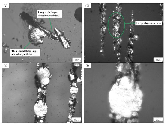There is little difference in the number of abrasive particles during the gear running-in period, and it is seen that the hard abrasive particles have little effect on the stable wear stage of the gear. The abrasive grains in Figure 7c are regular in shape and in the shape of discs and strips, which are generated by the normal wear and tear of the gear friction pair, indicating that the lubrication is good at this time. Figure 7d is the observed chain with large abrasive particles, which appears in the later, severe wear stage of gear wear, where various mixtures are mixed. The sticking matter is presumed to be a mixture of abrasive impurities and a small amount of sludge. The oil sample contains yellow wear debris. It is presumed that the copper alloy parts in the gearbox also experience abnormal wear. This means that, in addition to the serious wear of the gear tooth surface, the bearings and other components also suffer serious wear, and the gear enters a stage of severe wear. Figure 7e,f are the rounded abrasive grains under 300× and 500× mirrors, respectively. It is clear from the figure that the surface of the abrasive grain is smooth, and the boundary is regular.