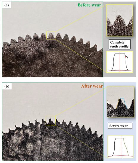 Tooth surface wear; (a) gear diagram before the experiment; (b) wear failure diagram of experimental gear.