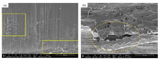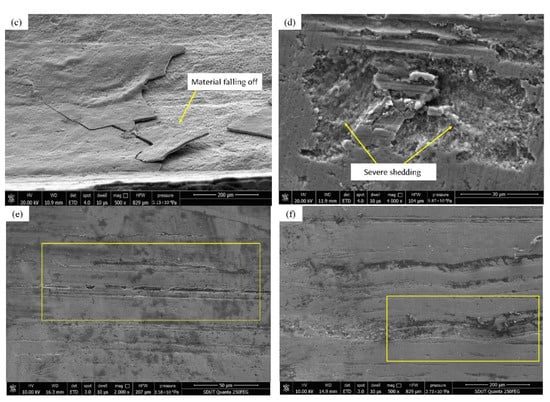 Figure 9e is the SEM image near the index circle on the tooth surface of the control group. Obviously, the wire cutting marks disappear and the surface is smoother, but there are more surface scratches and material peeling marks. Figure 9f is the SEM image near the tooth root of the control group. Since the tooth tip and the tooth root of the other gear are in contact and mesh first, the impact load generated during this process causes more grooves between the tooth tip and the tooth root. Compared with the surface topography of the experimental group gear, it is found that, although the gear tooth surface of the control group is also severely worn, the tooth surface is relatively flat, and there is no serious tooth surface gluing or plastic flow, so the gear is normal at this time. The stability is still good, the gear vibration is relatively small, and the gear has no obvious failure; the gear tooth surface of the experimental group has serious wear forms such as plastic flow, tooth surface gluing, and surface material shedding. The rapid loss of surface material causes damage on the surface of the gear teeth. The flatness is seriously reduced, the strength of the gear is reduced, and it causes strong abnormal vibration of the gear. The abnormal vibration causes the gear to wear more seriously, and finally, the gear fails prematurely.