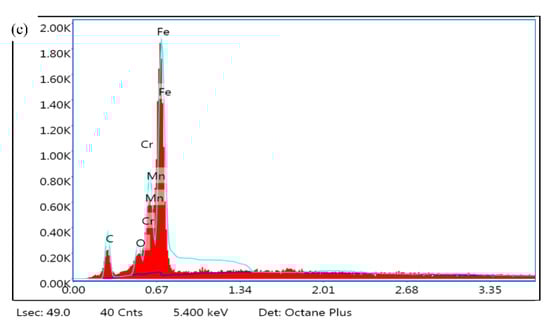 To further explore the gear wear state, composition and element analysis of the sludge mixture in the pitting pit is carried out. In this experiment, 45 steel is used; its main components are Fe, C, Si, and other elements. After analysis, in addition to these elements, there is also a high content of Gr and Mn elements, and the detection results are shown in Figure 10c below. GCr15SiMn is the material used in the cylindrical roller bearings of the various parts of the gearbox. The existence of these components is because the gears are worn and the bearings are also severely worn, and the generated wear debris enters the lubricating oil to form sludge. This phenomenon verifies the speculation that the bearings, and other components in the gearbox, are also severely worn in the ferrography analysis. It indicates that the tooth-breaking fault occurs in the stage of severe wear of the gear.