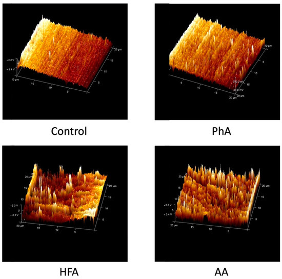 AFM representative images for the surface roughness of the ceramic surfaces treated with different conditioning methods; control, PhA etching group; HFA etching group, AA group.