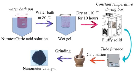Perovskite-type catalyst samples with formula of La1−xMxCo1−yNyO3 (M = Ce, Ca; N = Fe, Mn; x = 0, 0.1, 0.2, 0.3, 0.4, 0.5, 0.6; y = 0, 0.1, 0.2, 0.3, 0.4, 0.5, 0.6) were prepared by sol-gel method. La(NO3)3·6H2O, Co(NO3)2·6H2O, Ce(NO3)3·6H2O, Ca(NO3)2·6H2O, Mn(NO3)2·4H2O, Fe(NO3)3·9H2O, citrate acid, and deionized water were purchased from Shanghai Aladdin Biochemical Technology Co., Ltd., Shanghai, China. All the chemicals are analytical grade. Suitable amounts of chemicals based on stoichiometry were dissolved in deionized water to get a sol and the obtained solution was stirred vigorously using magnetic stirrer (JXX1-85-2, stirring speed 100–2000 r/min, Changzhou, China). The solution was heated on a water-bath pot (HH-1, control temperature 25–100 °C, accuracy ± 1.5 °C, Tsingtao, China); when the temperature of the solution was raised to 70 °C, a suitable amount of citric acid (the molar ratio of citric acid to metal ions is 1.2–1.5) was added and temperature was justified at 80 °C to evaporate to dryness with vigorous stirring. During the dehydration process, a poly condensation reaction carried out between nitrate ions and citric acid leading to formation of gel, the obtained wet gel was placed in a constant temperature drying box (WGL-125B, control temperature 25–300 °C, Tianjin, China) at 110 °C for 10 h to form a fluffy solid. The obtained bulk solid was placed in a Tube furnace (TL1200 Mini, Rated temperature 1100 °C, Guangzhou, China) calcined at 700 °C for 5 h and was cooled slowly to room temperature. Finally, the powders were finely ground to obtain the La1−xMxNyCo1−yO3 perovskite-type catalyst samples. The preparation process route of the catalyst samples is shown in Figure 1.