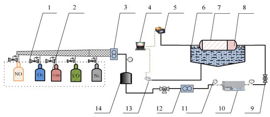 The overall structure of the simulation test bench. 1. Pressure-reducing valve. 2. Gas cylinder group. 3,12. Flowmeter. 4. Computer. 5. Gas analyzer. 6. Water bath pot. 7. Quartz tube. 8. Cordierite loaded with PM and catalytic agent. 9. Ball valve. 10. Tube furnace. 11. Pressure gauge. 13. Electronic balance. 14. Gas mixing chamber.