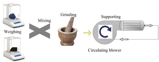 A simulation test bench for activity tests of catalyst samples is shown in Figure 2. The simulated exhaust gas can be provided by the gas cylinder group 2 (O2, N2, C2H4, CO, and NO) and mixed by the gas mixing chamber 14. The tube furnace 10 was used to control the temperature of the mixed gas and the water-bath pot 6 can maintain the exhaust temperature in the Quartz tube 7. According to reference [], the exhaust gas temperature of diesel engine is allowed to vary from 550 °C to 650 °C. Therefore, the simulated exhaust gas temperature can be maintained at 600 °C by adjusting the tube furnace. The cordierite was used to support PM and catalyst samples, the mass of supported PM and catalyst samples was 18 mg, the mass ratio of PM to catalyst samples was 1:1, the supporting process of PM and catalyst samples is shown in Figure 3. The moderate PM and catalyst samples were set in the circulating blower, which was sealed before the supporting process. When the circulating blower started, the porous structure of cordierite can capture all of the powder PM and catalyst samples. The cordierite supported with PM and catalyst samples was placed inside the quartz tube 7, the length of quartz tube is 200 mm, which is twice that of cordierite, and their diameter is 80 mm, the gas analyzer (Horida Ltd., MEXA-4000FT, relative error 1.7%, Kyoto, Japan) was used to detect the concentration of gas generated after purification, the electronic balance (PWN224ZH, repeatability deviation 0.01 mg, Shanghai, China) was used to measure the mass of cordierite before and after purification.