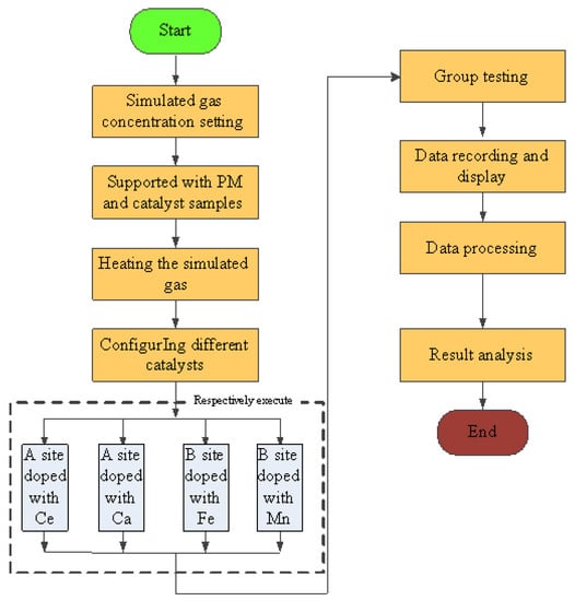 All the experiments were carried out under the condition of room temperature and shading. The simulated gas was prepared by mixing O2, N2, C2H4, CO. and NO, and the gas ratio concentration was strictly controlled by the throttle valve and the flowmeter (DMF-1-S6, accuracy ± 1%), the gas flow rate of O2, N2, C2H4, CO, and NO can be controlled to 10 mL/min, 89.81 mL/min, 0.3 mL/min, 0.8 mL/min, and 0.8 mL/min separately. And the total flow rate was set to 10 mL/min, the concentration of simulated exhaust gas was shown in Table 1 [,]. The space velocity was . When the experiment starts, the simulation test bench works stably for 10 min, according to the experimental requirements firstly. Then, experimental results were recorded and the test flow chart is shown in Figure 4. The conversion of CO, HC, NOx, and PM were calculated as follows: