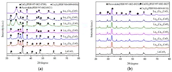 XRD patterns of catalyst samples: (a) La1−xCexCoO3 catalyst samples; and (b) La1−xCaxCoO3 catalyst samples.