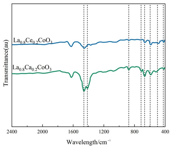 FTIR spectra of La0.8Ce0.2CoO3 and La0.8Ca0.2CoO3 catalyst samples.
