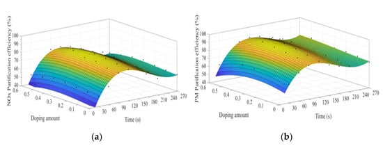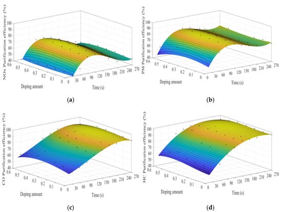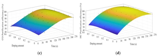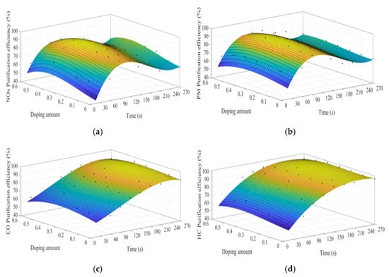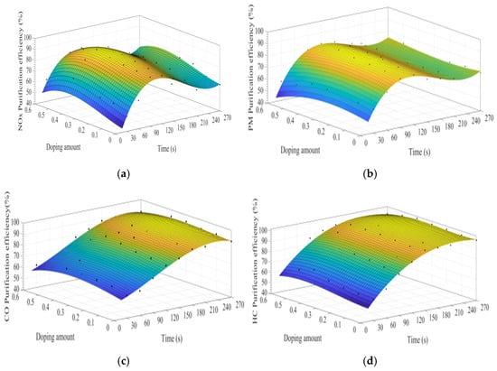 MATLAB software was used to fit the experimental data. Figure 7a–d show the time curve of the purification efficiency of NOx, PM, HC, and CO when the A site was doped with different concentrations of cerium ions. As can be observed from Figure 7, when the purification time does not exceed 90 s, the purification efficiency increases with time. At this time, the catalyst samples are in the heating stage and do not exert the best catalytic performance. When the time exceeds 90 s, the purification efficiency reaches the highest. When the purification time exceeds 120 s, the purification efficiencies of NOx and PM show an obvious downward trend, which can be attributed to the decrease of PM load with purification time increases, decreasing the NOx and PM redox reaction rate. When the doping amount does not exceed 0.2, the purification efficiencies of NOx, PM, HC, and CO improve with the increase of the doping amount. When x = 0.2, the purification efficiency can reach the highest, which can reach 85%, 90%, 94%, and 100%, respectively. When x > 0.3, excessive cerium ions were not doped in perovskite-type oxide, too much impurity phase was introduced into the catalyst samples. These impurities have poor purification efficiency on NOx, PM, HC, and CO, which are consistent with the results of XRD.