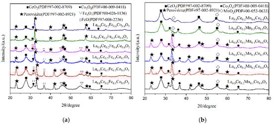 XRD patterns of catalyst samples: (a) La0.8Ce0.2Co1−yFeyO3 catalyst samples; and (b) La0.8Ce0.2Co1−yMnyO3 catalyst samples.