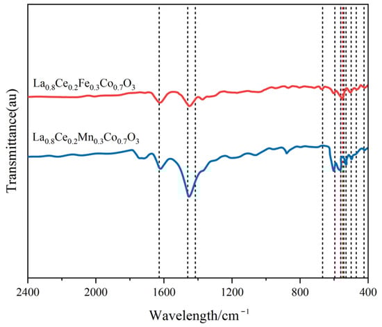 FTIR spectra of La0.8Ce0.2Fe0.3Co0.7O3 and La0.8Ce0.2Mn0.3Co0.7O3 catalyst samples.