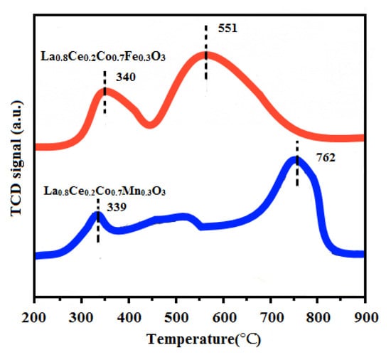 The H2-TPR experiments were conducted on a TPDRO instrument (TP-5080, Xianquan, Tianjin, China) using a thermal conductivity detector (TCD). H2-TPR techniques were used to measure the reducibility of La0.8Ce0.2Co0.7Fe0.3O3 and La0.8Ce0.2Co0.7Mn0.3O3 catalyst samples. The corresponding H2-TPR profiles are presented in Figure 15. Both of the samples exhibit two major reduction peaks, the first reduction peak of La0.8Ce0.2Co0.7Fe0.3O3 at 340 °C can be attributed to the reduction of Fe4+ to Fe3+ and consumption of adsorbed oxygen []. The first reduction peak of La0.8Ce0.2Co0.7Mn0.3O3 at 339 °C can be attributed to the reduction of Mn4+ to Mn3+ consumption of adsorbed oxygen []. The second reduction peak of La0.8Ce0.2Co0.7Fe0.3O3 appears at 551 °C, which can be ascribed to the reduction of Fe3+ to Fe2+ and consumption of lattice oxygen []. The second reduction peak of La0.8Ce0.2Co0.7Mn0.3O3 appears at 762 °C, which can be ascribed to the reduction of Mn3+ to Mn2+ and consumption of lattice oxygen []. Through the analysis above, it can be concluded that the redox properties and the oxygen mobility of the catalysts are important influencing factors in purification efficiency of NOx, PM, HC, and CO.