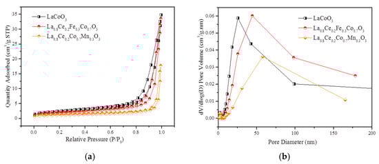 Figure 17a,b show N2 adsorption isotherms and pore size distribution (PSD) curves of LaCoO3, La0.8Ce0.2Fe0.3Co0.7O3, and La0.8Ce0.2Co0.7Mn0.3O3 perovskite-type catalyst samples separately. Based on the International Union of Pure and Applied Chemistry classification (IUPAC), the isotherms curves in Figure 17a reveals an H3 hysteresis loop related to mesoporous or macroporous materials. It can be seen that the order of specific surface area is LaCoO3, La0.8Ce0.2Fe0.3Co0.7O3, and La0.8Ce0.2Co0.7Mn0.3O3. Significant increase in nitrogen adsorption at high relative pressure (0.9 < P/P0 < 1) and the PSD curves illustrate the extensive existence of the mesopores and macropore, which are well consistent with the analysis of SEM. Figure 17b reveals that La0.8Ce0.2Fe0.3Co0.7O3 perovskite -type catalyst sample has the largest pore volume of mesopores (mainly concentrated in 50 nm). The detailed textural parameters of catalyst samples are listed in Table 2. It is widely accepted that the impurities formation as a consequence of the limited accommodation of A and B cations leads to a progressive decrease of specific surface area []. Based on the above analysis, it can be further inferred that the impurity content of La0.8Ce0.2Co0.7Fe0.3O3 perovskite-type catalyst crystal samples is less than that of La0.8Ce0.2Co0.7Mn0.3O3 perovskite-type catalyst crystal samples, which are consistent with the results of XRD and FT-IR.
