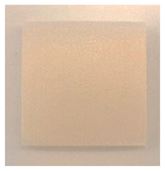 In this study, 3D-printed photopolymers were fabricated using a PolyJet 3D printer (J750, Stratasys, Eden Prairie, MN, USA). Figure 1 illustrates that the size of the substrates used in this study was 30 mm × 30 mm × 5 mm (thickness). These substrates comprised two photopolymers: VeroWhite 835 and Agilus 30. Photopolymers with different Shore A hardness values were obtained by adjusting the ratio of VeroWhite 835 and Agilus 30. The Shore A hardness 95 consists of 95% VeroWhite 835 and 5% Agilus 30. The Shore A hardness 85 consists of 85% VeroWhite 835 and 15% Agilus 30. The Shore A hardness 50 consists of 50% VeroWhite 835 and 50% Agilus 30.