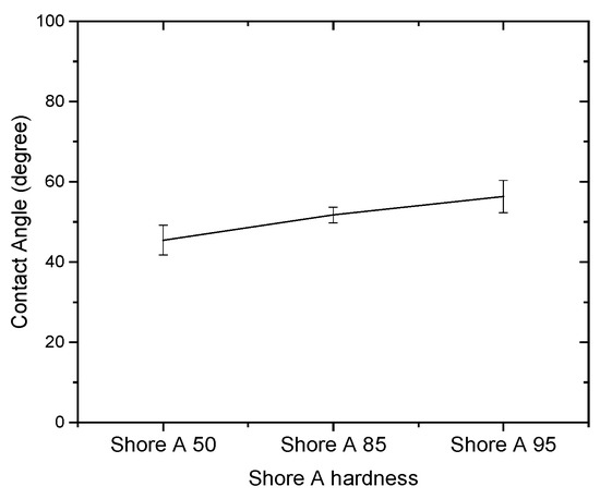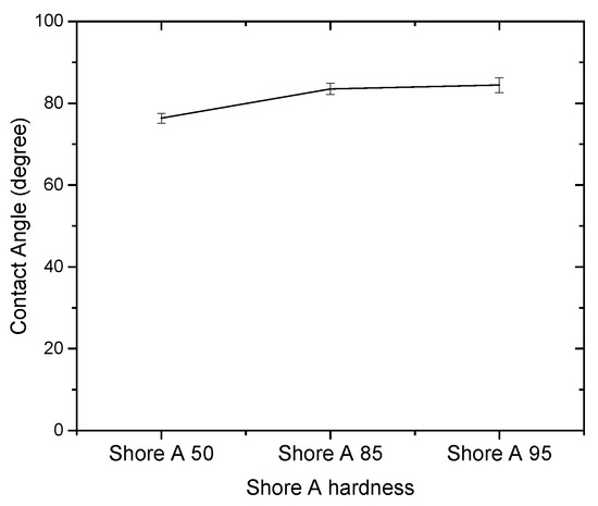 Contact angles of distilled water on substrates with different Shore A hardness values.