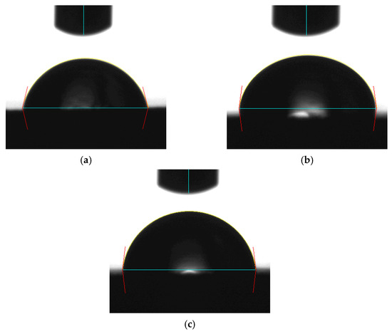 Typical contact angle images of distilled water on Parylene C coated on substrates with a Shore A hardness of (a) 50, (b) 85, and (c) 95.