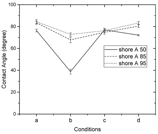 Contact angles of distilled water on Parylene C coated on substrates with different Shore A hardness values: (a) unsoaked, (b) soaked in 10% sodium hydroxide, (c) soaked in 10% ammonium hydroxide, and (d) soaked in 100% phosphate-buffered saline.