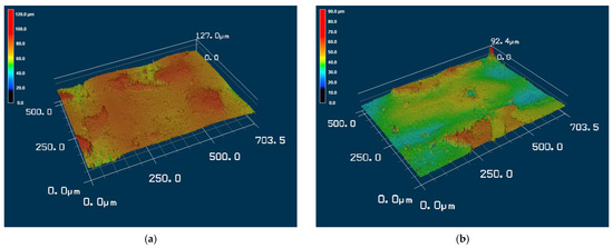 Three-dimensional topographies of the substrate with a Shore A hardness of 95: (a) without and (b) with Parylene C coating.