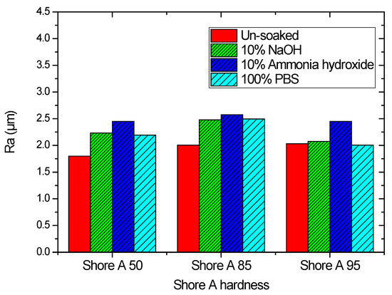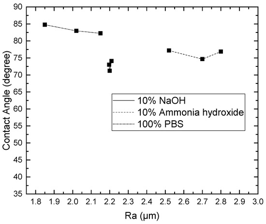 To examine the effects of the aforementioned three solutions on the surface roughness of the samples, the arithmetic average roughness (Ra) was experimentally investigated through the laser confocal microscope. In this paper, Ra is the arithmetic average of the ratio of the absolute values of the measured profile height deviations to the evaluation length. Table 2 presents the Ra values of the substrates with and without Parylene C. As demonstrated in Table 2, the Ra values of the substrates with Parylene C coating were lower than those of the uncoated substrates. This result is consistent with that obtained for a different substrate by Verwolf et al. [47]. Figure 6a,b shows the 3D topographies of the substrate with a Shore A hardness of 95 without and with Parylene C coating, respectively. These 3D topographies were the surface profiles extracted from measurement data of the laser confocal microscope. The results obtained in Figure 6 and Table 2 exhibit an identical trend. Figure 7a,b shows the surface area of the substrate with a Shore A hardness of 95 without and with Parylene C coating, respectively. The grains observed in Figure 7a are probably a result of the polymerization by UV exposure. In addition, some voids were observed when the substrate with a Shore A hardness of 95 coated with Parylene C (Figure 7b). Figure 8 depicts the Ra values of the substrates with different Shore A hardness values. The Ra value for the substrate with a Shore A hardness of 50 was smaller than those for the substrates with Shore A hardness values of 85 and 95. The Ra value increased with the Shore A hardness when the substrates were not soaked. Subsequently, the effects of the three solutions on the Ra values of the substrates coated with Parylene C were compared. The substrate with a Shore A hardness of 50, coated with Parylene C, exhibited a higher Ra value when soaked in 10% ammonium hydroxide than when soaked in the other two solutions. This result might be caused by the presence of neutral ammonia molecules in the solution. The Ra value was high when the substrate coated with Parylene C, with a Shore hardness of 85, was soaked in 10% ammonium hydroxide. This result is consistent with that obtained for the substrate with a Shore A hardness of 50. These results imply that the reaction between the alkaline ammonium hydroxide and Parylene C caused the aforementioned behavior for the substrate with a Shore A hardness of 85. Except for soaking in 10% ammonium hydroxide, the solutions had a slight effect on the Ra values of the substrate coated with Parylene C and had a Shore A hardness of 95. Finally, based on the present data in Figure 5 and Figure 8, the correlations between roughness and contact angle (CA) can be presented in Figure 9, Figure 10 and Figure 11. Figure 8 shows that the contact angles of Parylene C on a substrate with a Shore A hardness of 50 decreased with increasing Ra when the substrate was soaked in 10% sodium hydroxide and 100% PBS. However, soaking in 10% ammonium hydroxide did not appreciably change the contact angle of Parylene C on the substrate with a Shore A hardness of 50. One explanation for this is that the surface topography changed due to neutral ammonia molecules in the solution. Figure 10 reveals that the contact angles of Parylene C on a substrate with a Shore A hardness of 85 decreased with increasing Ra when the substrates were soaked in 10% sodium hydroxide, 10% ammonium hydroxide, and 100% PBS. These results revealed that decreasing wetting may be explained by the roughness. Figure 10 depicts the contact angles of Parylene C on a substrate with a Shore A hardness 95 was decreased with decreasing Ra when the substrates were soaked in 10% sodium hydroxide and 100% PBS. The Ra value was high when the substrate coated with Parylene C, with a Shore hardness of 95, was soaked in 10% ammonium hydroxide. Due to the surface topography not changing, the contact angle was high when the substrate coated with Parylene C, with a Shore hardness of 95, was soaked in 100% PBS. The correlations between roughness and contact angle (CA) can be expressed as: