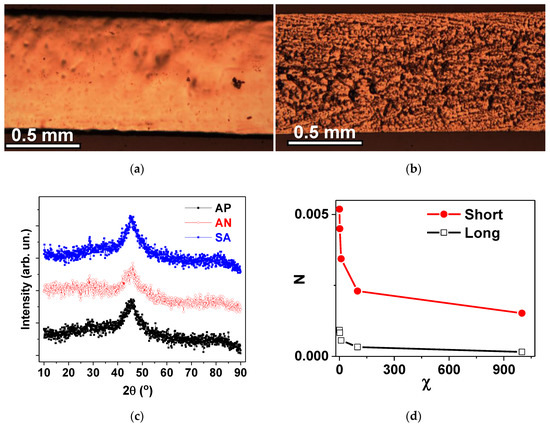 General view of the surface of amorphous ribbons obtained by optical microscopy: free side (a) and weal side (b) of the Fe3Co67Cr3Si15B12 amorphous ribbon. (c) XRD spectra for all types of the samples. (d) Demagnetizing factors calculated for selected values of magnetic susceptibility χ and two different lengths of the samples: l = 5 mm for “short” and l = 45 mm for “long” samples.