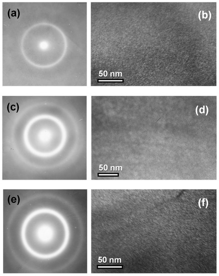 Microdiffraction patterns (a,c,d) and electron micrographs (b,d,e) for Fe3Co67Cr3Si15B12 rapidly-quenched ribbons in following states: AP (a,b); AN (c,d); and SA (e,f) (see also Table 1).