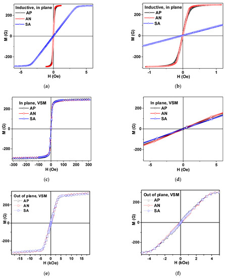 Magnetic hysteresis loops of amorphous Fe3Co67Cr3Si15B12 ribbons in different states, with AP, AN and SA measured by: inductive technique (a,b); by VSM in the plane of the sample (c,d); and out-of-plane of the sample (e,f). For inductive measurements, sample length was l = 45 mm and for VSM samples, the length was l = 5 mm.