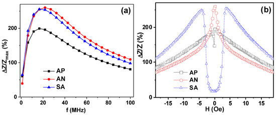 Figure 4b shows that the SA amorphous ribbon is an excellent candidate for small magnetic field detection due to very high sensitivity with respect to applied field, and a reasonably low field (few Oe) required to reach the highest sensitivity. Calculation of the maximum sensitivity with respect to an applied magnetic field gives the following values: Δ(ΔZ/Z) = 9%/Oe (0.10 < H < 1.80 Oe) for AP; Δ(ΔZ/Z) = 50%/Oe (0.15 < H < 1.80 Oe) for AN; Δ(ΔZ/Z) = 140%/Oe (1.80 < H < 3.20 Oe) for SA. The field interval for linear dependence of ΔZ/Z(H) and the sensitivity rate are very good for creation of the small magnetic field sensitive elements with shifted work point. One of the advantages of the proposed SA material is the reduced lengths of the sensitive element showing such an advanced sensitivity. In many previous works, the lengths of the sensitive elements were approaching 10 cm [17].