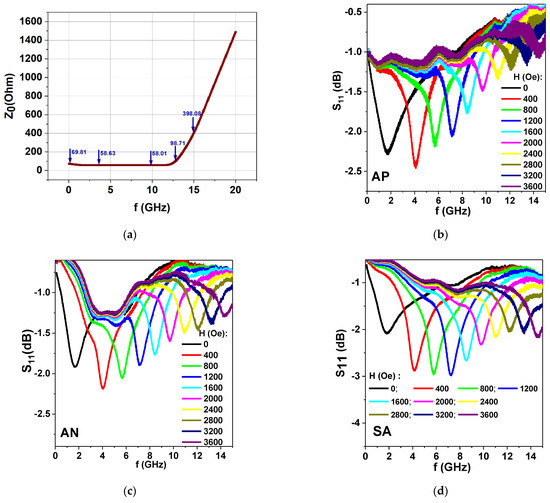 (a) Calculation of characteristic impedance Z0 (values indicated by blue arrows) of a waveguide consisting of a coaxial line and a thick planar sample. Blue arrows show the simulation results for the approximation to the 50 Ohm matching waveguide characteristic impedance (in the frequency range of 0.5 to 12.5 GHz). (b–d) S11 parameters measured in the broadband regime for Fe3Co67Cr3Si15B12 amorphous ribbons in different states AP, AN and SA for the external magnetic field applied in the plane of the ribbons. The measurements were made for different values of the external magnetic field.