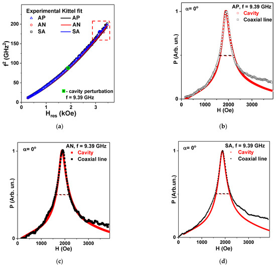 Microwave absorption measurements using a complete coaxial waveguide for Fe3Co67Cr3Si15B12 amorphous ribbons in different states AP, AN and SA. Experimental results and Kittel´s fit. (a) Dashed rectangle indicates the frequency range where the measurements are still possible but less precise as the approximation to the 50 Ohm matching waveguide characteristic impedance (Z0) deviates. (b–d) Direct comparison of the FMR resonance lines obtained for the frequency f = 9.39 GHz both by the cavity perturbation technique and using the coaxial waveguide for all ribbon types. Red and black dashed lines indicate the width of the FMR resonances.