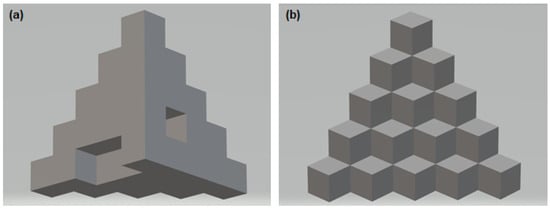 Three-dimensional calibration models (a) back, (b) front with the following dimensions: object overall x, y, z dimension = 25 mm. Each layer of cubes is 5 mm high. Base layer cutout: 5 mm high, 5 mm deep, 10 mm wide. The 2nd layer cutout: 5 mm high, 5 mm deep, 5 mm wide.